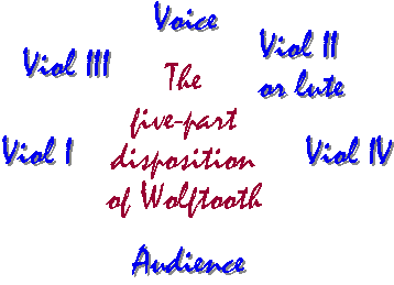 The basis of Wolftooth's disposition is one instrument, or voice, for each part, and equality between parts. The voice is treated as an equal part of the consort, but given a central position.